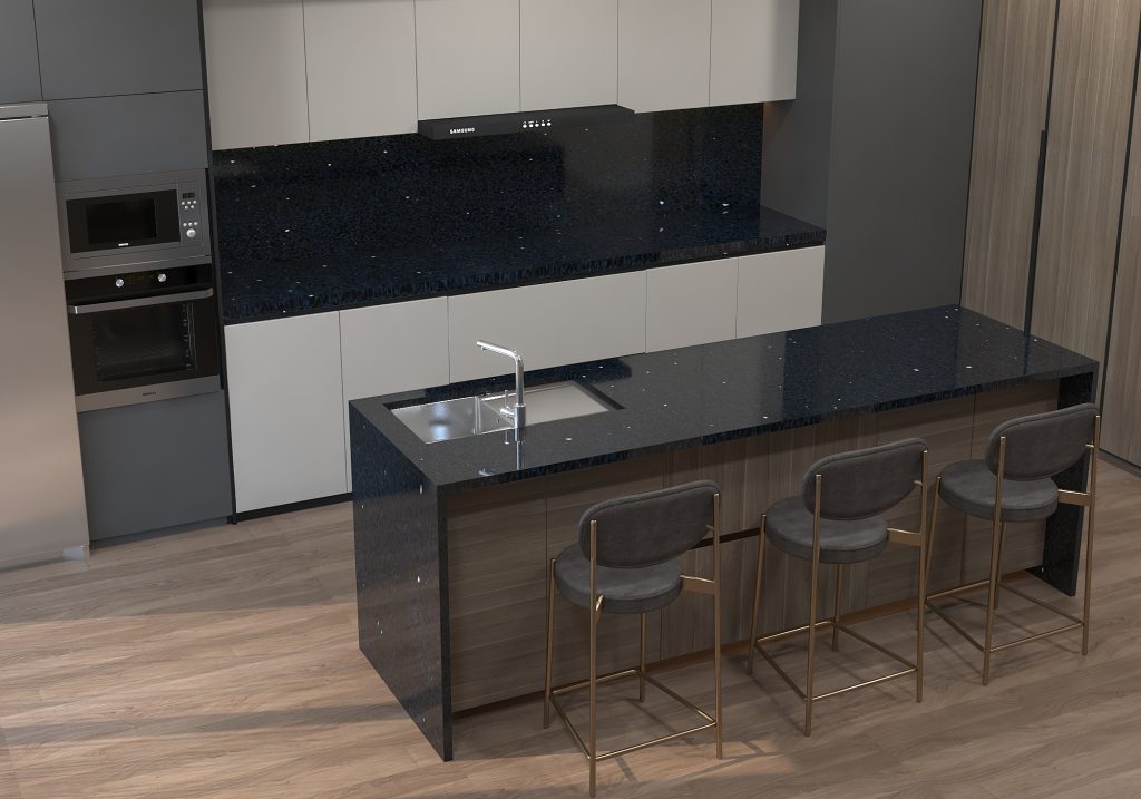 Black Shimmer by Quartz City DESCRIPTION Finish: Polished Slab Size: 3200mm x 1600mm Available in 20mm and 30mm Thicknesses Application: Indoor Stain-resistant | Scratch-resistant | Heat-resistant Anti-bacterial properties Easy to maintain and clean Warranty: 10-year Manufacturers Warranty Description: A polished black base with a slight, delicate shimmer evenly distributed throughout. BOOK A VIEWING REQUEST A SAMPLE