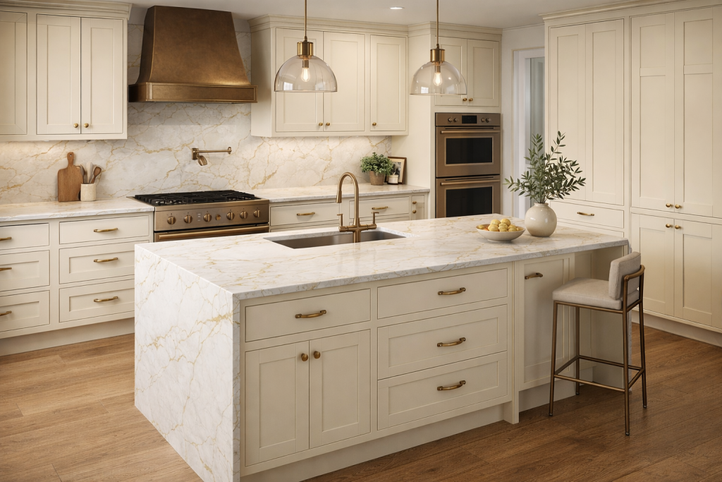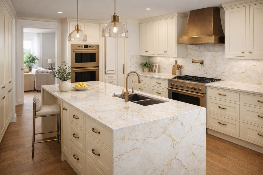 Golden Pearl by Quartz City DESCRIPTION Finish: Polished Slab Size: 3200mm x 1600mm Available in 20mm and 30mm Thicknesses Application: Indoor Stain-resistant | Scratch-resistant | Heat-resistant Anti-bacterial properties Easy to maintain and clean Warranty: 10-year Manufacturers Warranty Description: The golden pearl has a warm, pearly-based quartz slab married with Gold veins, giving it a luxurious feel. BOOK A VIEWING REQUEST A SAMPLE